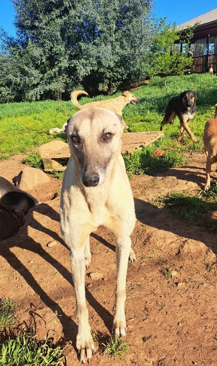 Hermoso y gigante mestizo de galgo, cariñoso, joven, sociable, se lleva bien con gatos y perros.